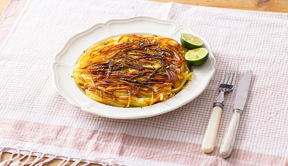 表面のじゃがいもがカリッとして鮭に火が通るまで両面をしっかりと焼きます。お好みでパセリをふり、すだちを添えます。