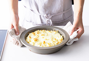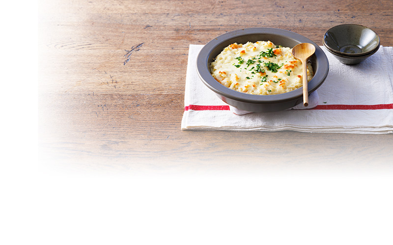 カリフラワーをたっぷり入れて食感のアクセントに。熱々を冬に食べたいドリアです。