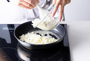 生クリーム、ご飯を加えたら塩胡椒で味を整えます。