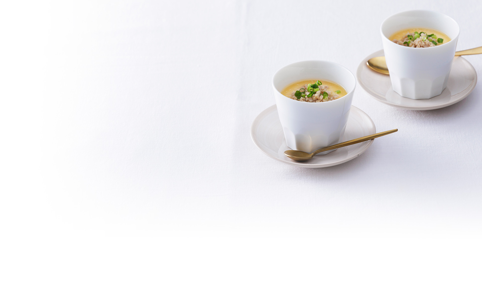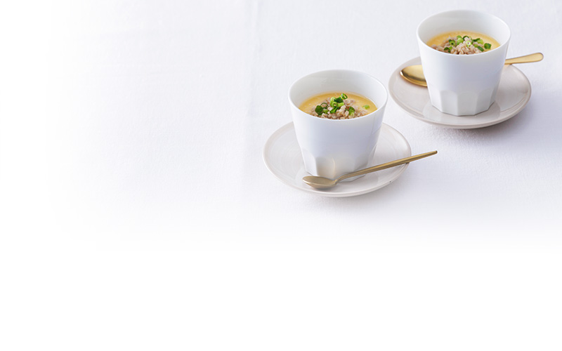 蒸しあがった茶碗蒸しに⑥のそぼろを調味料ごとかけ、小口切りにした細ねぎを乗せたら完成です。蒸したての温かいうちにお召し上がりください。