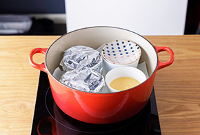やかんに入れた熱湯を鍋肌から器の1/3位まで注ぎ、鍋のふたをします。強火にかけ蒸気が出たら弱火にし、8~10分蒸します。