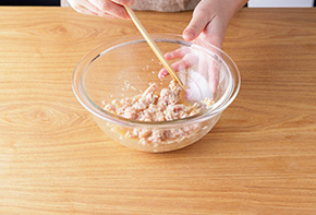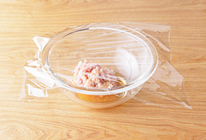 耐熱の器に鶏ひき肉、[A]を入れます。ラップをして電子レンジで加熱します。(600w1分半)