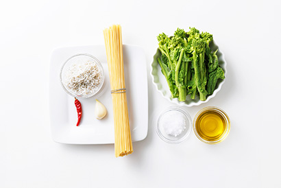 菜の花は4等分に切り、にんにくは半分に切り芽を取ってつぶします。赤唐辛子は種を取って輪切りにします。