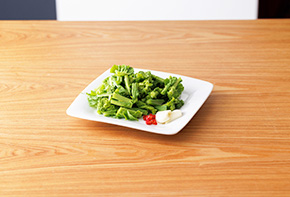 にんにくの香りが出たら、菜の花を加えて火を強め、焼き色がつくまでしっかりと炒めます。