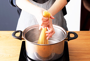 大きめの鍋に2リットルの湯を沸かし、塩を加えてパスタを茹でます。パスタの茹で時間は表示時間より1分ほど短めに茹で、ゆで汁を1/4カップほど取っておきます。