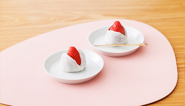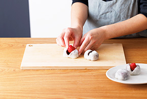 いちごを包むように生地を調えて完成です。いちごは小さめだと形が良く仕上がりますし、大きめだと手作りならではの贅沢ないちご大福が作れます。