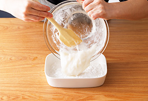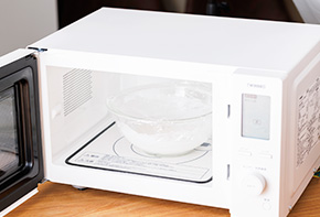 ラップをして電子レンジで加熱します(600w 2分)。一度取り出し、ゴムベラでよく混ぜて再度ラップをして加熱します(600w 1分30秒)。