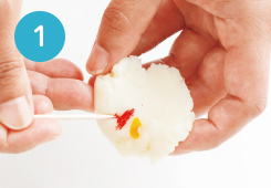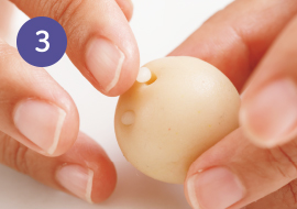 ❸くぼみをつける 上下を指ではさんで押した後、箸などで上部にくぼみをつけます。