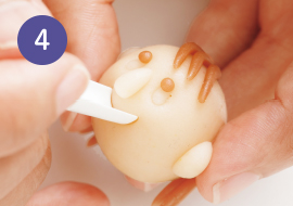 ❹髪と口を作る 頭の前と後ろに髪の毛(茶)を作り、口を竹串などでかたどります。