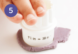 ❶胴体を作る パープル色に着色し、おだんご状にまるめたマジパン(「まずは準備」参照)を楕円状に整えます。