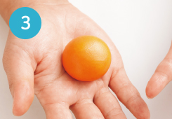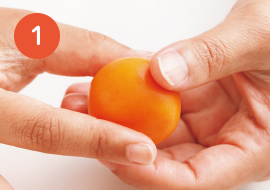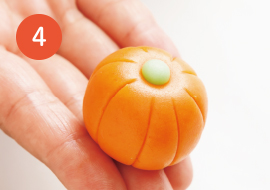 ❶かぼちゃの形を作る オレンジ色に着色し、おだんご状にまるめたマジパン(「まずは準備」参照)を楕円状に整えます。