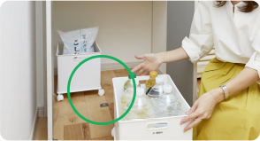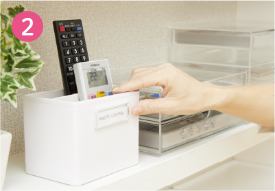毎日使うモノを、使う場所の近くへ収納。白いケースなら見た目もスッキリ!