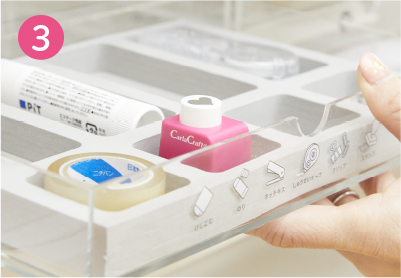文房具などを入れるケースを用意し、種類ごとに収めて「指定席」にはラベリングを忘れずに!