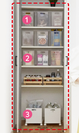 上のほうは軽いモノ、下は重いモノを収納。分類はスーパーマーケットを参考にすると◎。