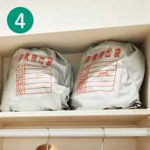 非常用袋は最低限のモノだけ入れて玄関に収納するのがベスト。持ち出し用の非常用袋は玄関に、食品など備蓄用はパントリーへ収納して管理しましょう。