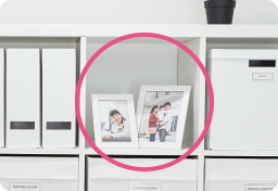 結婚、子どもの誕生そして成長にともない、思い出の写真や作品はどんどん増えていきます。家族一人ひとりの適正量を決めて、本当にお気に入りのものだけを厳選して収納するのがスッキリをキープする秘訣。