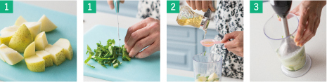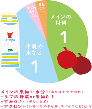スムージーを作る際には、果物などメインとなる材料と同量またはやや少なめの水分(水や牛乳など)を使いましょう。また、小松菜などの青菜を使う場合は、メイン材料の約1割程度の比率におさえると飲みやすくなります。