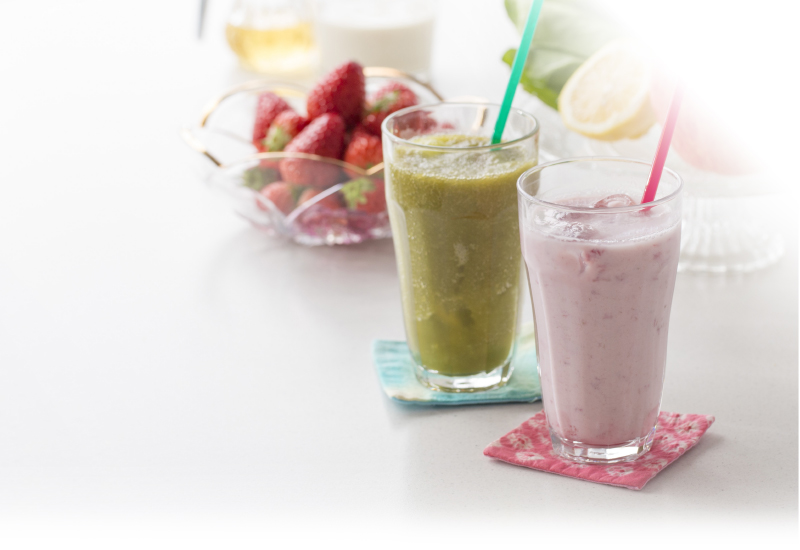 スムージーとジュースの決定的な違いは、果物や野菜を「皮ごと使う」ことにあります。スムージーは皮の内側に含まれる豊富な食物繊維やビタミンなどの栄養素がそのまま吸収でき、30歳をピークに減少していく酵素も手軽に補えます。また液体状にすることで同量の果物や野菜をそのままで食べるよりも摂取しやすく、消化吸収がアップされるのもポイント。お肌や腸内環境にもうれしい効果が期待できるので、女性はもちろん、野菜嫌いなお子様にもぜひおすすめしたい飲み物です。