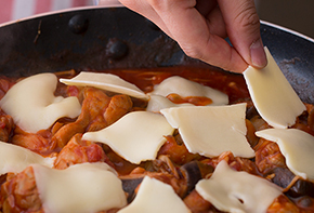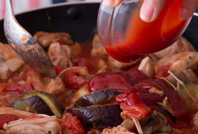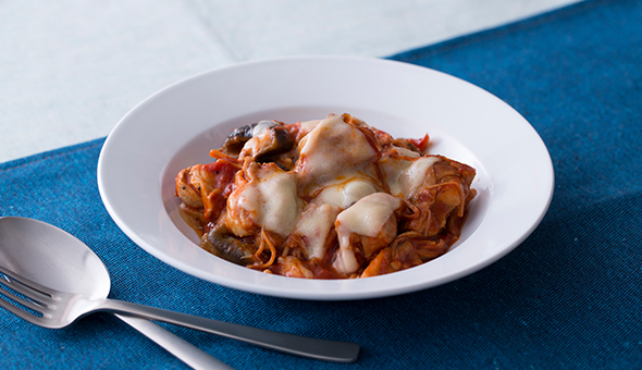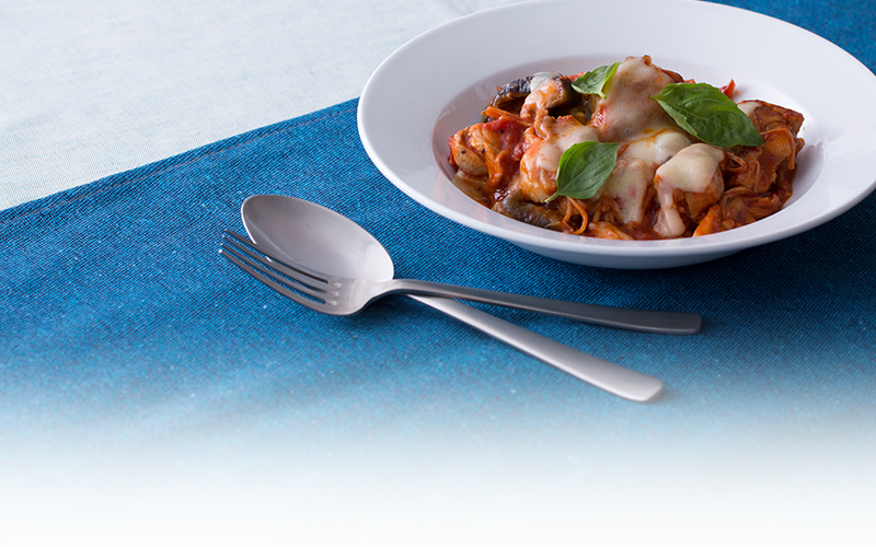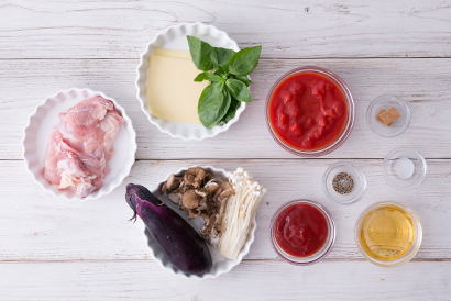 若鶏と旬のナス、そしてきのこもたっぷり使った栄養満点のトマト煮込みです。