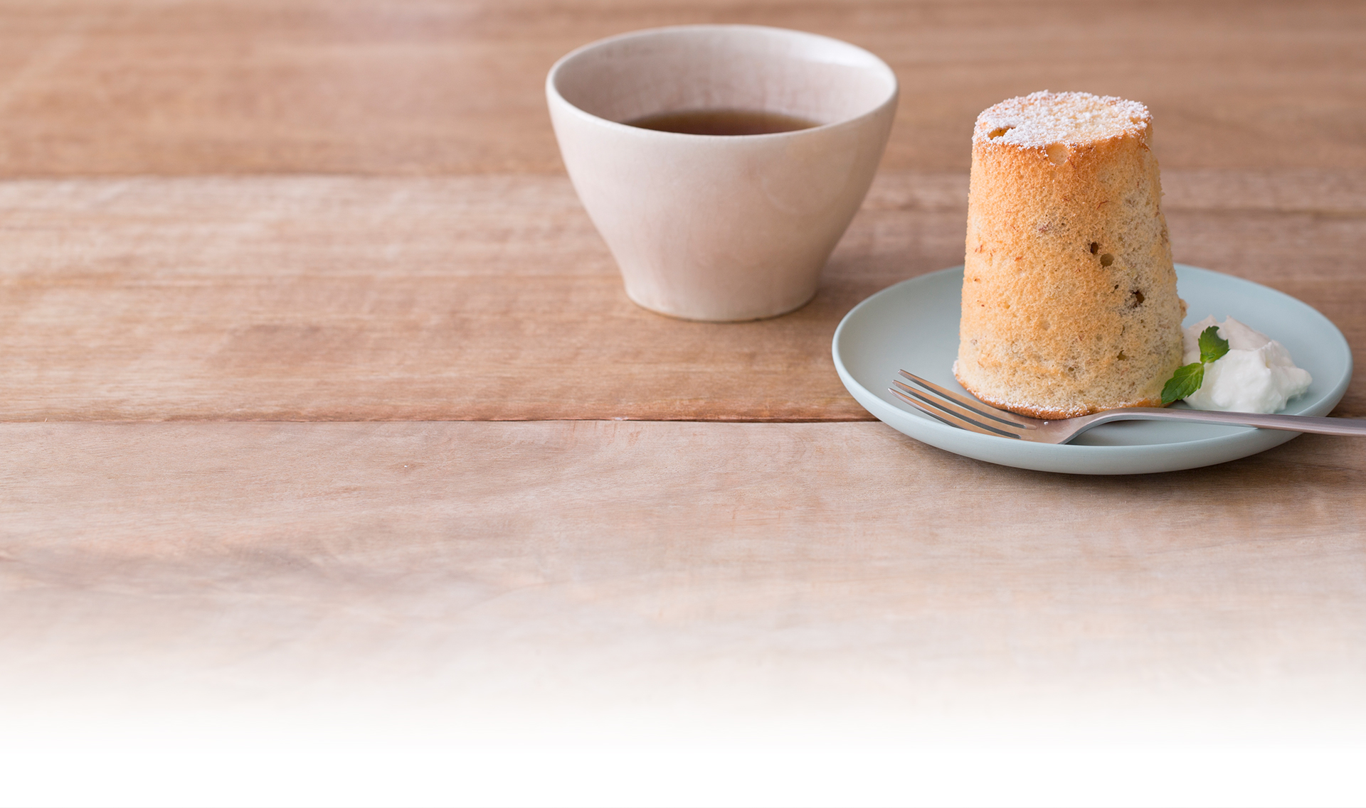 生地が完全に冷めたら紙コップから外し、水切りしたヨーグルトとミントを添えて粉砂糖をふります。同分量で17cmのシフォン型1個でも作れます。焼き時間はオーブンによって加減してください。