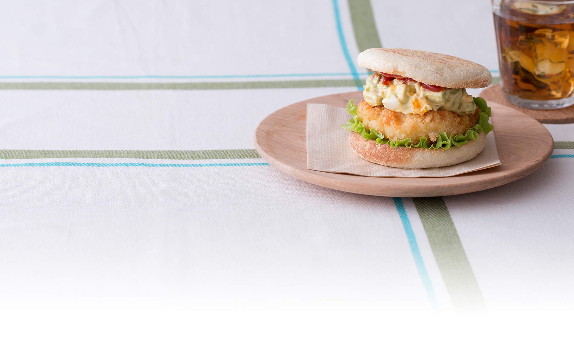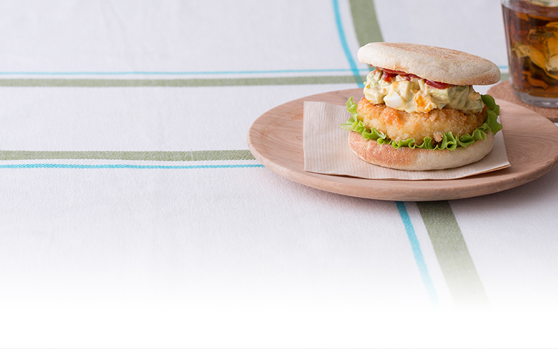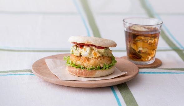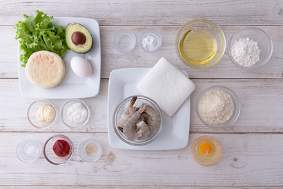 レタスをしいて、エビカツにアボカドソースをかけ、イングリッシュマフィンで挟みます。ボリュームのあるマフィンバーガーの完成!