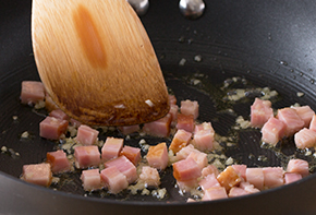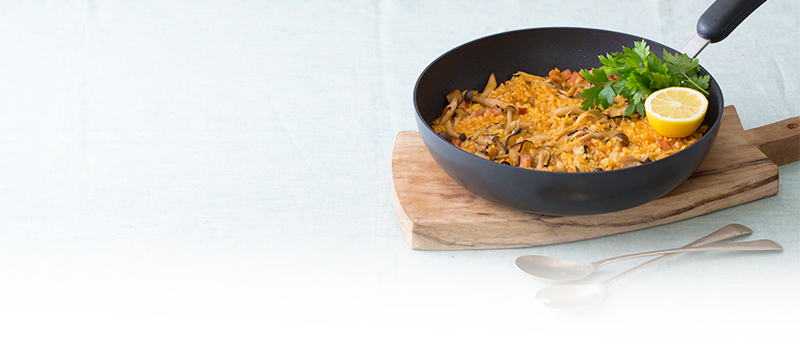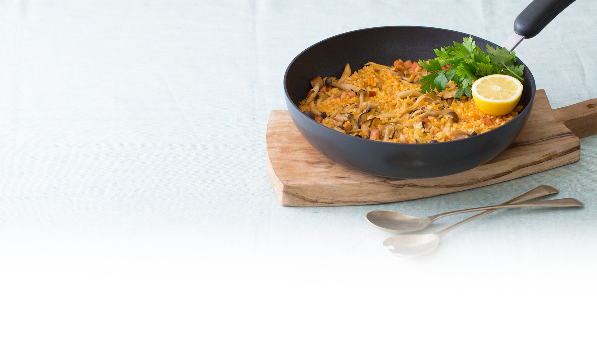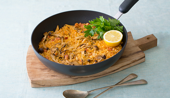 出来上がったらパセリとレモンを添えます。火を止める前の強火の焼き加減でおこげが楽しめます。レモンをぎゅっとしぼってかけるとまた違った味わいに。黒こしょうをたっぷり挽いてもおいしくいただけます。