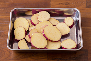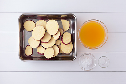 さつまいもは1cm厚さの半月か輪切りにし、水に漬けてアクを抜き、水気を切ります。