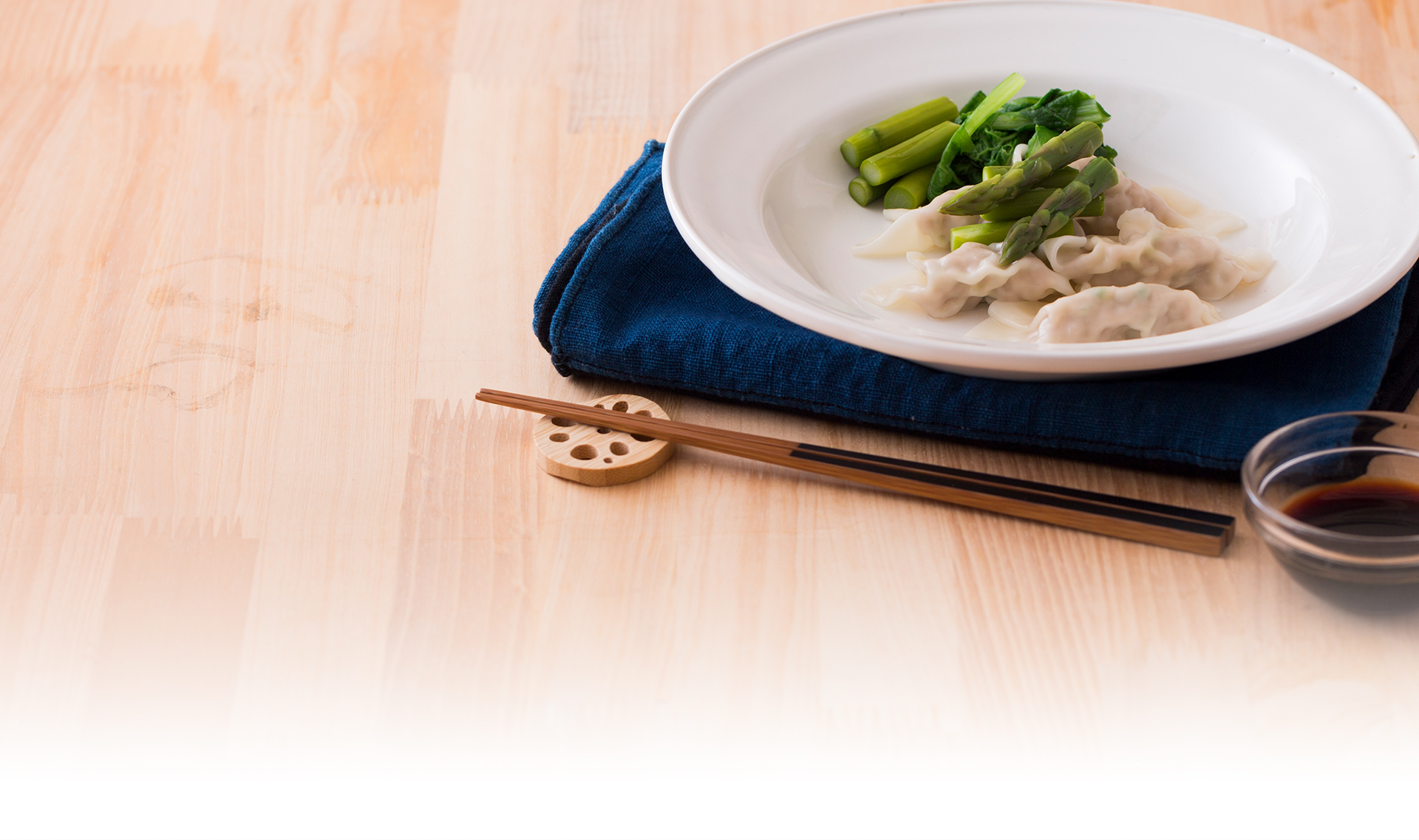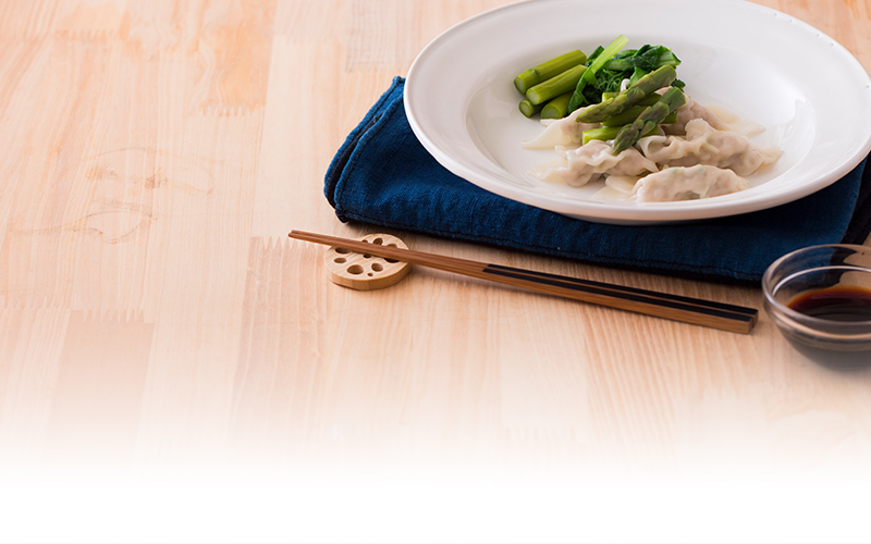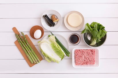 白菜とネギはみじん切りにし、しょうがはすりおろします。アスパラとなばなは食べやすい大きさに切っておきます。