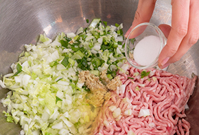 ボウルに豚肉ミンチ、白菜、ネギ、しょうがを入れ、卵白と塩を加え混ぜ合わせます。