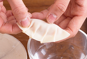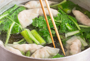 餃子が浮いてきたら、なばなを入れてさっと茹でます。