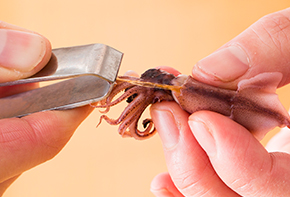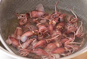 粘りの出ないように仕上げるために温かいスープを何度かにわけてひたひたに加えることと、米を混ぜ過ぎないことがポイントです。ホタルイカを軽くつぶして混ぜると旨みとコクがでます。