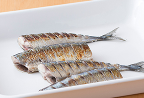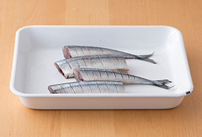 さんまは頭を切って内臓を取って洗い、水気をふいて半分に切ります。表側に切込みを入れて塩を適量振り、しばらく置きます。