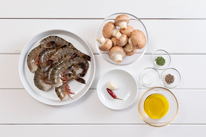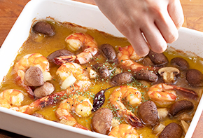 耐熱皿にエビ、にんにく、マッシュルーム、赤唐辛子を入れ、オリーブオイルを具材が浸るまで回し入れ、塩・こしょうをふります。