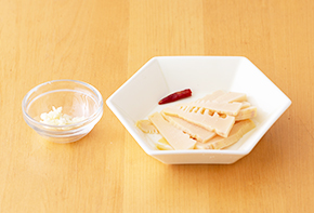 にんにくはみじん切りにし赤唐辛子は種を取って半分に切ります。たけのこはスライスします。