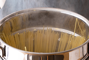 パスタを茹でる湯に入れる塩の量が味を決めるポイントです。