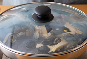 ④にあさり、酒を加えて蓋をし、あさりの口が開くまで蒸します。