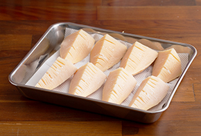 切ったたけのこをペーパーの上に並べて水気をよく取っておきます。