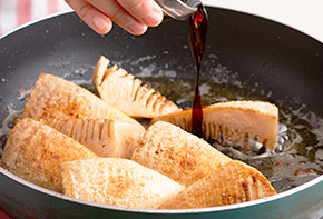切り口と背中部分を焼き色が付くまで焼いたら火を止め、仕上げにしょうゆを回し入れ、全体によく絡めます。