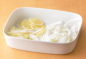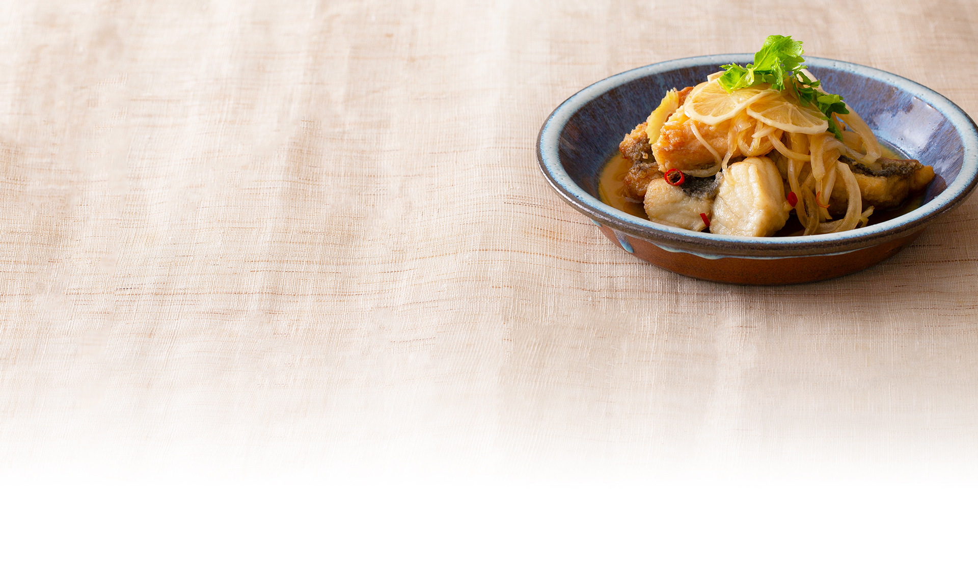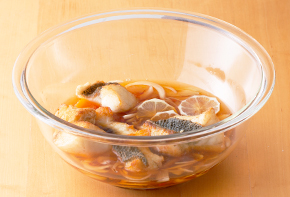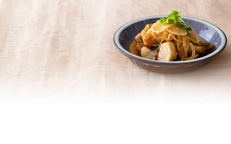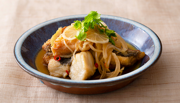 器に盛りつけ、刻んだセロリの葉を散らしたら完成です。出来たては魚の柔らかい食感が楽しめます。冷やして味が馴染んだものもまた格別です。