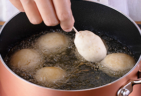 じっくり揚げることで生地が膨らんでまん丸の可愛い形に揚がります。お好みでケチャップとマスタードをつけても。