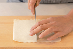 玉ねぎとハーブはみじん切り、春巻きの皮は半分に切っておきます。