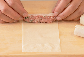 春巻きの手前に具材を置き、コロコロと巻いていきます。最後に水で溶いた小麦粉を塗って巻き終わりをくっつけ、左右の肉がはみ出ていたら整えます。これを8個作ります。