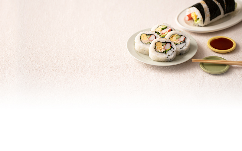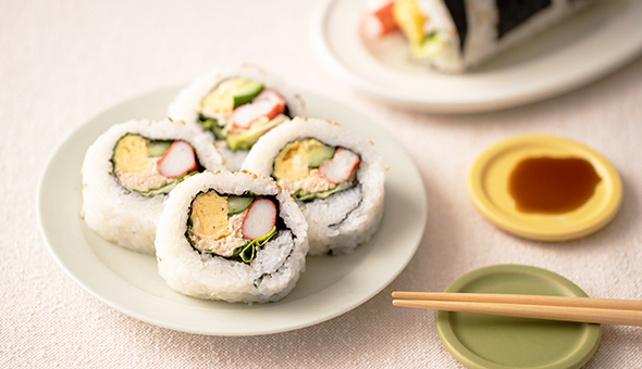 好みで切り分け、器に盛って完成です。アボカドやカニ缶などでアレンジするのもおすすめです。切らずにそのままで恵方巻にも。