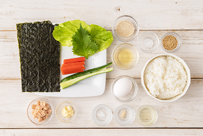 ③を裏返し、海苔の上に、サラダ菜、しその葉、きゅうり、卵焼き(各1個)カニカマ(2個)、半分量のツナマヨネーズをのせます。