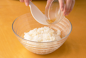 [A]は砂糖が溶けるようによく混ぜておきます。温かいご飯に[A]を回しかけ、よく混ぜます。うちわ等であおぎ、冷まします。