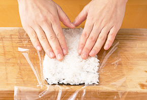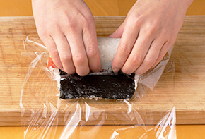 ラップの端を持ち、具を巻き込むようにして崩れないようにぎゅっとしめます。(ラップは巻き込まないように注意)残りの部分もしっかりと巻き、巻き終わりを下にしてしばらく置きます。