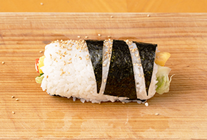 手に入りやすい具材で手軽に作れるサラダ巻き。裏巻きにして海苔を貼り、虎柄のように仕上げて節分用に。
