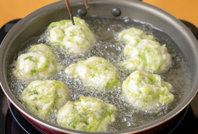 油を180℃に熱し、スプーンを使って生地を落として揚げます。