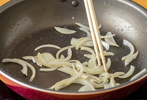 残りの油と玉ねぎを入れて、半透明になるまで炒めます。