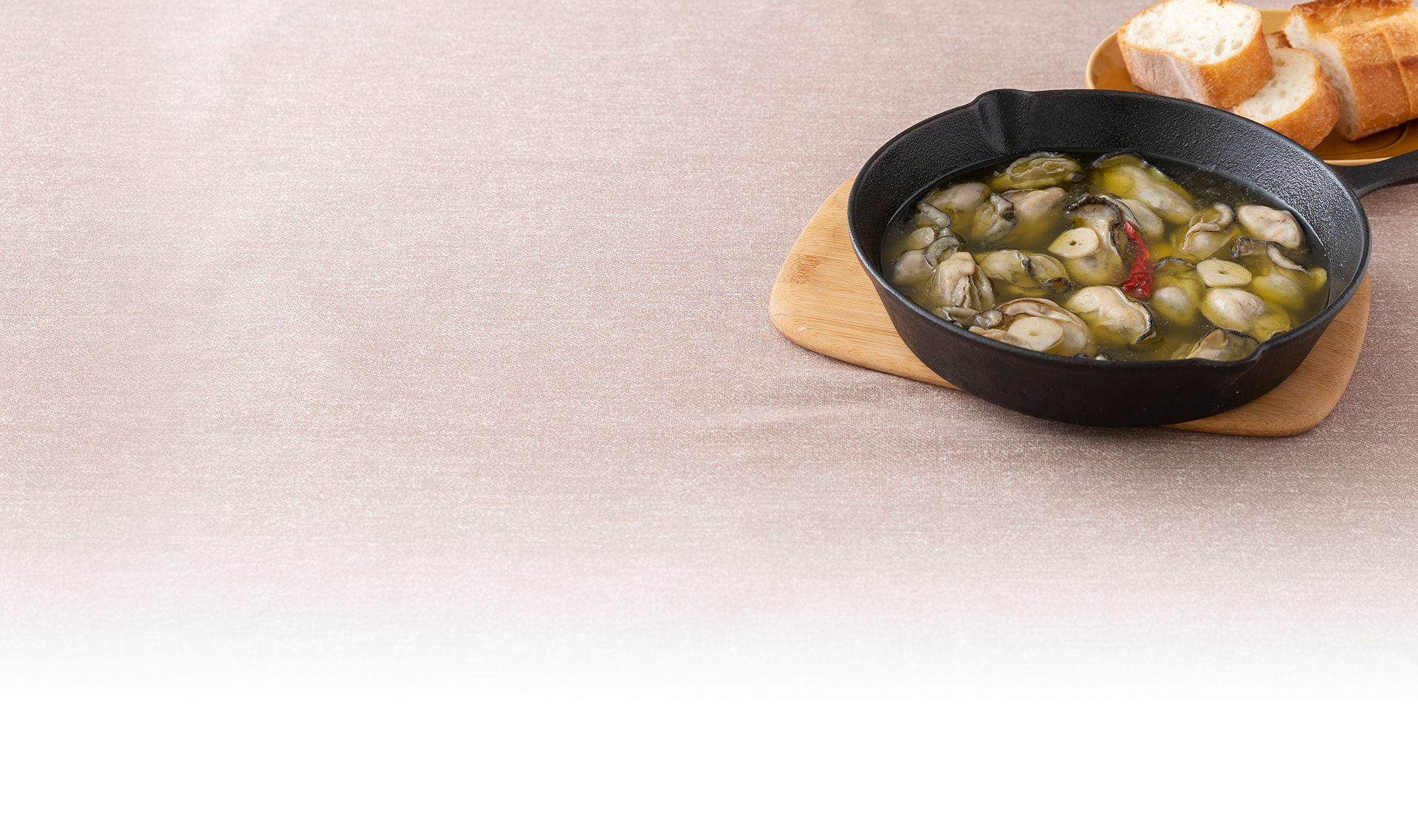 食べやすく切ったバゲットを一緒に用意して、牡蠣を乗せたり、オイルに浸していただきます。